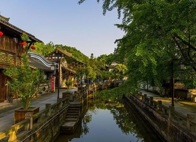 岷江的支流味江流經(jīng)地勢(shì)平緩的街子鎮(zhèn)口,形成一泓碧潭——龍?zhí)?。古?zhèn)水系發(fā)達(dá),地下水豐富,石板路兩側(cè)及屋前院后,常年清水不斷,因而有“川西水鄉(xiāng)”之名?!扒喑呛蠡▓@”之稱。景區(qū)屬亞熱帶濕潤(rùn)氣候,年平均氣溫15.9℃,盛夏氣溫低于成都市區(qū)4—5℃,全年均適宜旅游。